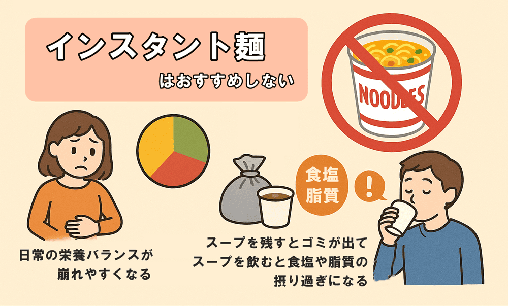 インスタント麺を食べる機会が増えることで、食塩や脂質の摂り過ぎになります。