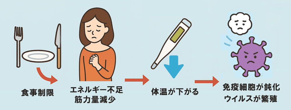 無理な食事制限は、ビタミン、ミネラル、タンパク質といった、免疫細胞の生成や機能維持に欠かせない栄養素の不足を招きます。