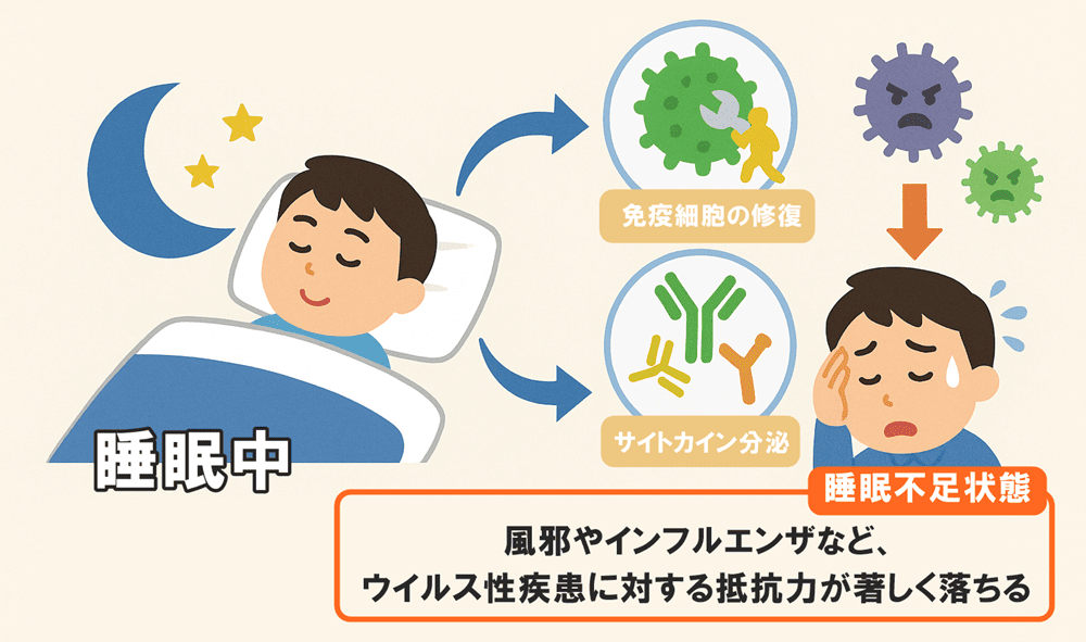 睡眠中には、免疫細胞が修復され、サイトカインという免疫を調整する物質が分泌されます。