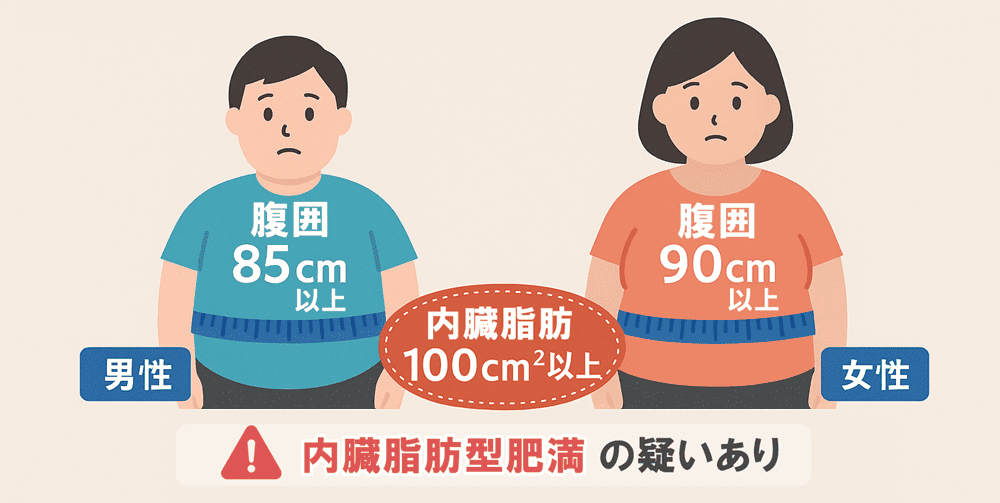 腹囲は、男性は85cm以上、女性は90cm以上で、内臓脂肪100cm²以上に相当し、「内臓脂肪型肥満の疑いあり」に該当します。