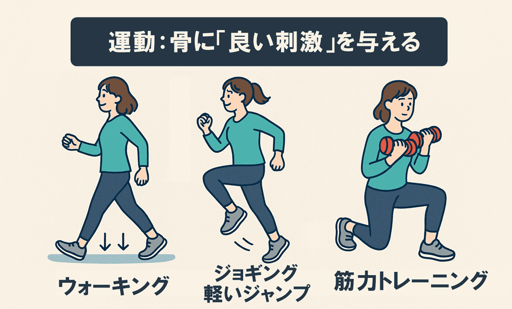 ジョギング・軽いジャンプ:骨への刺激をより高めます。(ただし膝などに痛みがある場合は医師に相談)