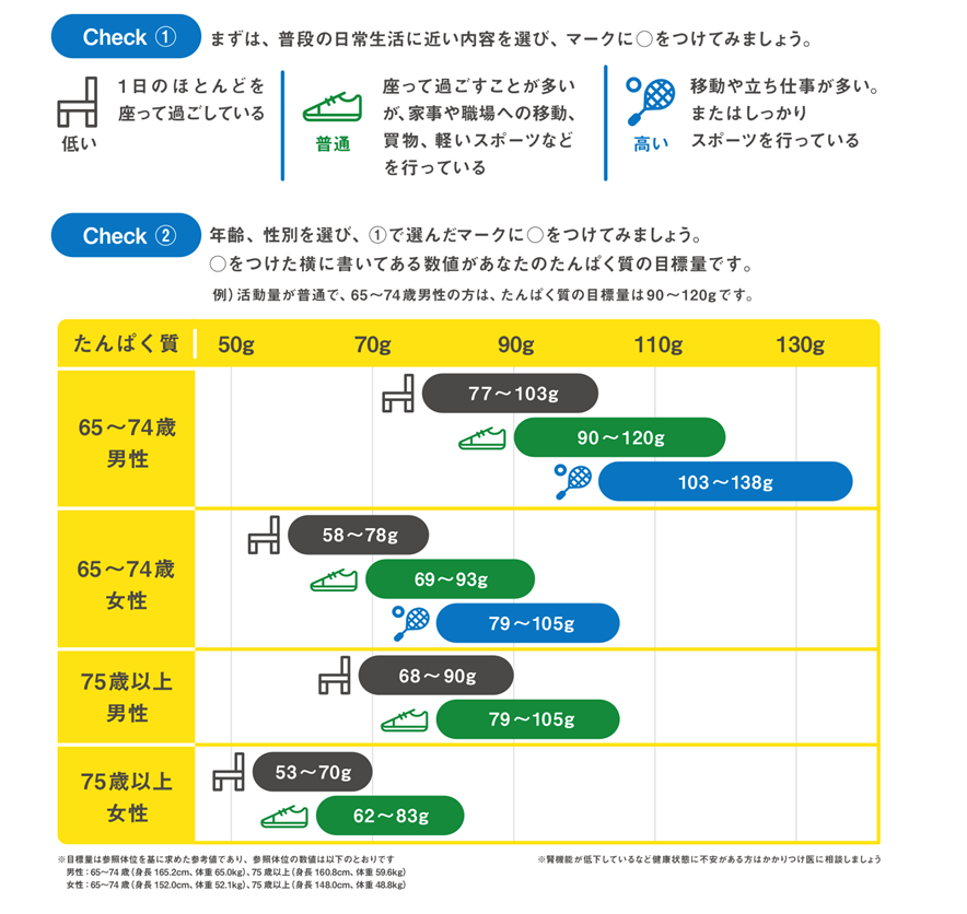 ここでは、厚生労働省で出している、健康維持を目的としたたんぱく質の必要量を掲載しておきます。※3