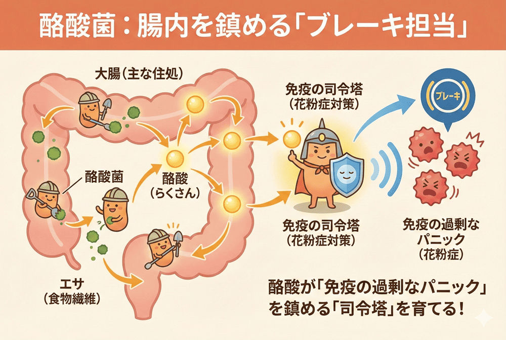ここが花粉症対策のポイントなのですが、この「酪酸」こそが、免疫の過剰なパニックを鎮める「司令塔」を育てる貴重なエネルギー源になるのです。