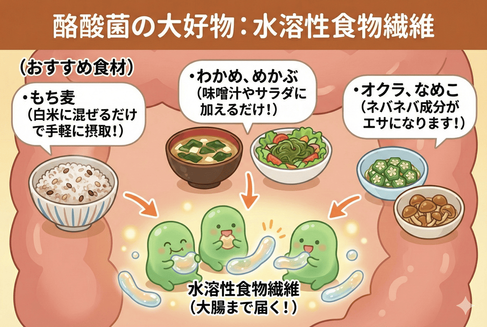 彼らの大好物は、大腸まで消化されずに届く「水溶性食物繊維」です。