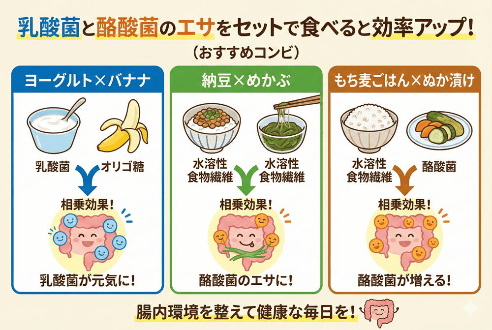 乳酸菌と酪酸菌のエサをセットにすると、腸内での連携がさらにスムーズになります。