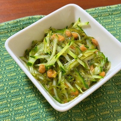 写真の「めかぶとキュウリの納豆和え」のように野菜と海藻を両方使うと、シャキシャキとトロトロの両方の食感が楽しめますよ。
