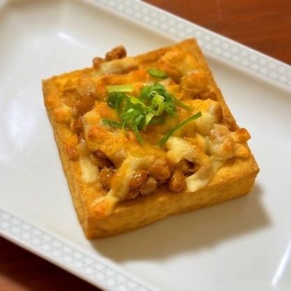 写真は厚揚げに納豆とチーズを乗せてトースターで3分程度焼いて、だし醤油とネギをかけただけの簡単メニューです。