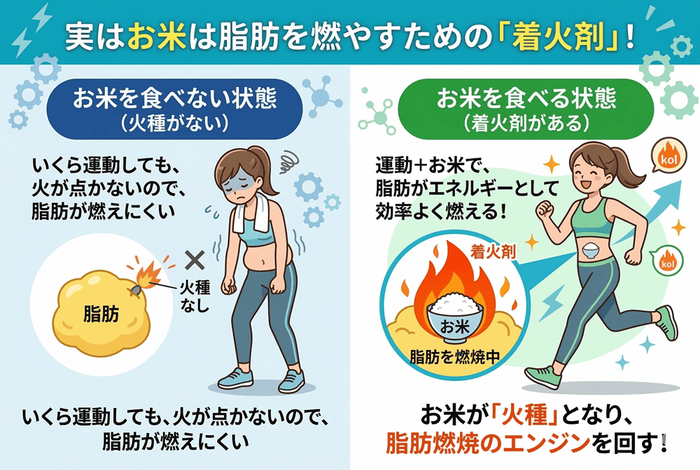 お米を食べないと火種がない状態なので、いくら運動しても脂肪が燃えてくれないんです。