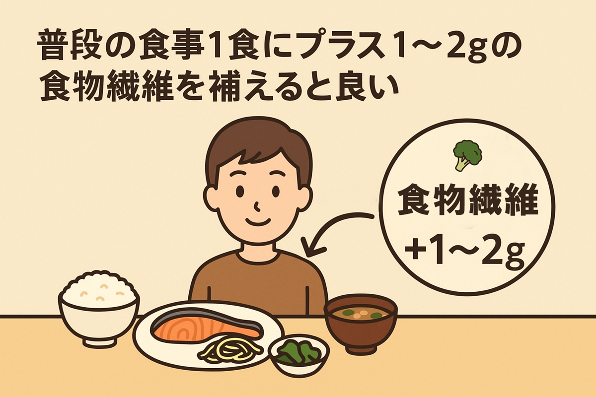 普段の食事1食にプラス1~2gの食物繊維を補えると良いでしょう。