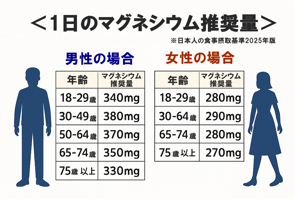 日本人の食事摂取基準2025年版では、1日のマグネシウム推奨量は下記の量が提示されています。