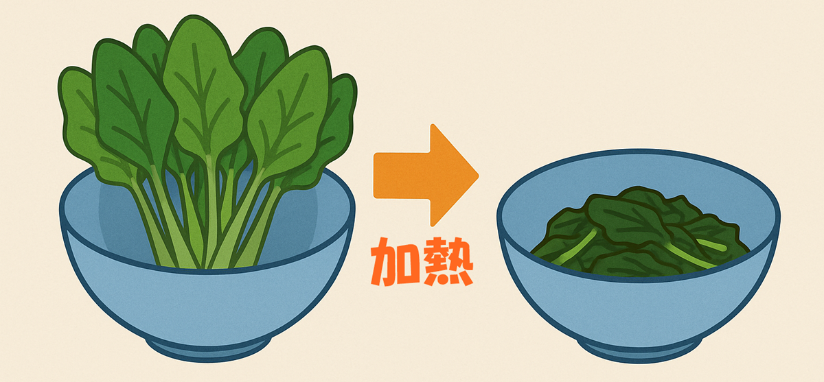 特に小松菜やほうれん草などの葉物野菜は、加熱して水気を切るととても小さくなりますよ。