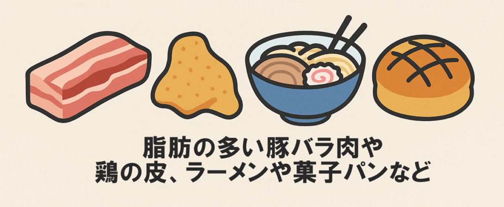 脂肪の多い豚バラ肉や鶏の皮、ラーメンや菓子パンなどをよく召し上がる方は要注意です。