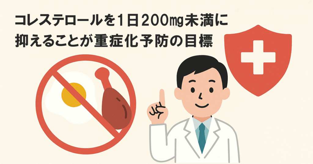 既にLDLコレステロール値が高い方は、コレステロールを1日200㎎未満に抑えることが重症化予防の目標です。