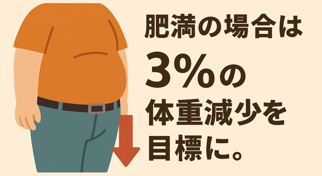 動脈硬化性疾患予防ガイドライン2022年版において、肥満の場合は3%の体重減少を目標に定めています。