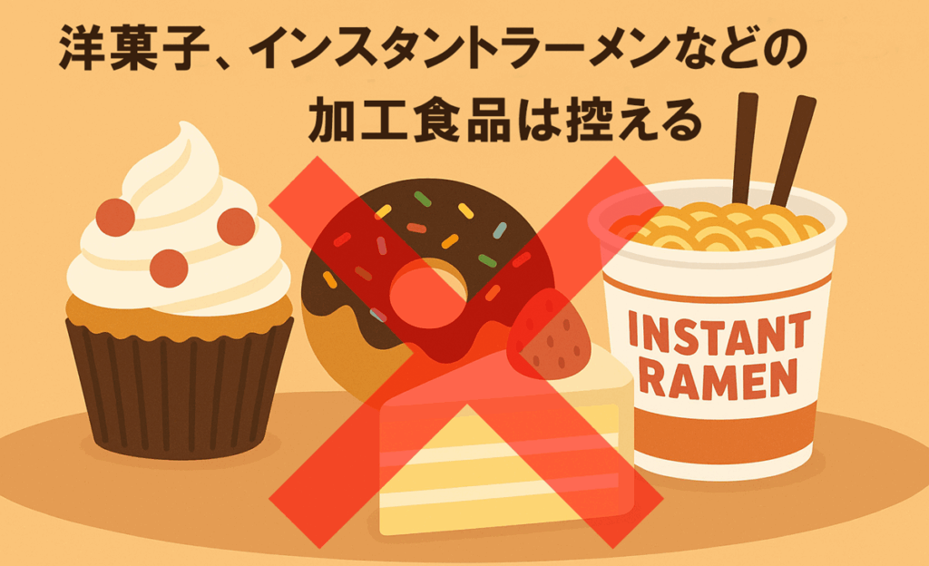 - 洋菓子、インスタントラーメンなどの加工食品は控える