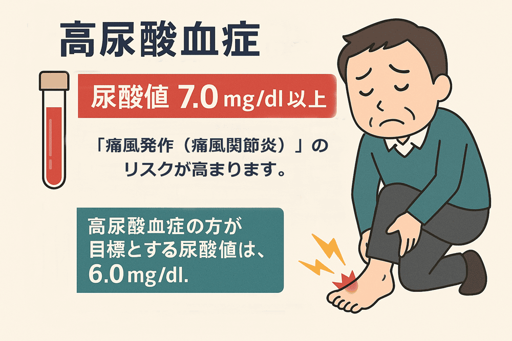 高尿酸血症の方が目標とする尿酸値は、6.0mg/dlです。