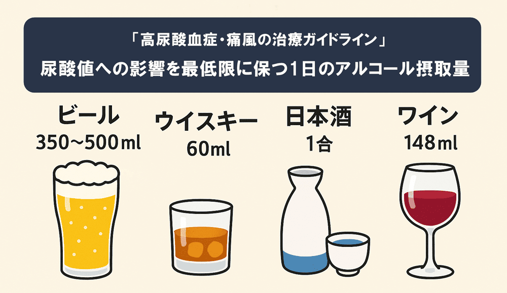 「高尿酸血症・痛風の治療ガイドライン」では、尿酸値への影響を最低限に保つ1日のアルコール摂取量として、下記のように提示しています。