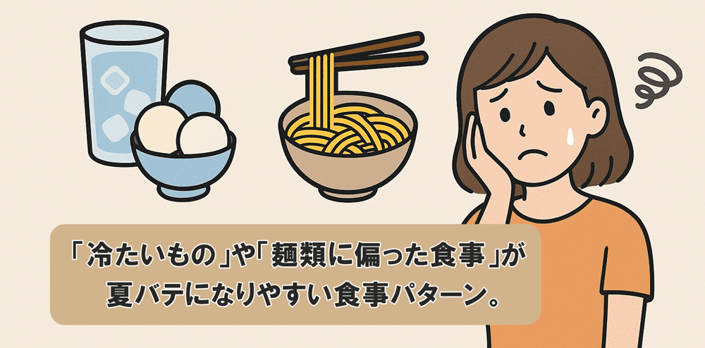 実は、夏に多くなる「冷たいもの」や「麺類に偏った食事」が夏バテになりやすい食事パターンです。