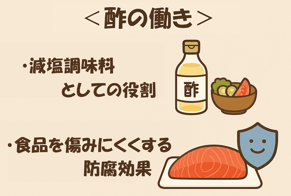 酢に含まれる「酢酸」は、細菌増殖を抑える働きがあります。