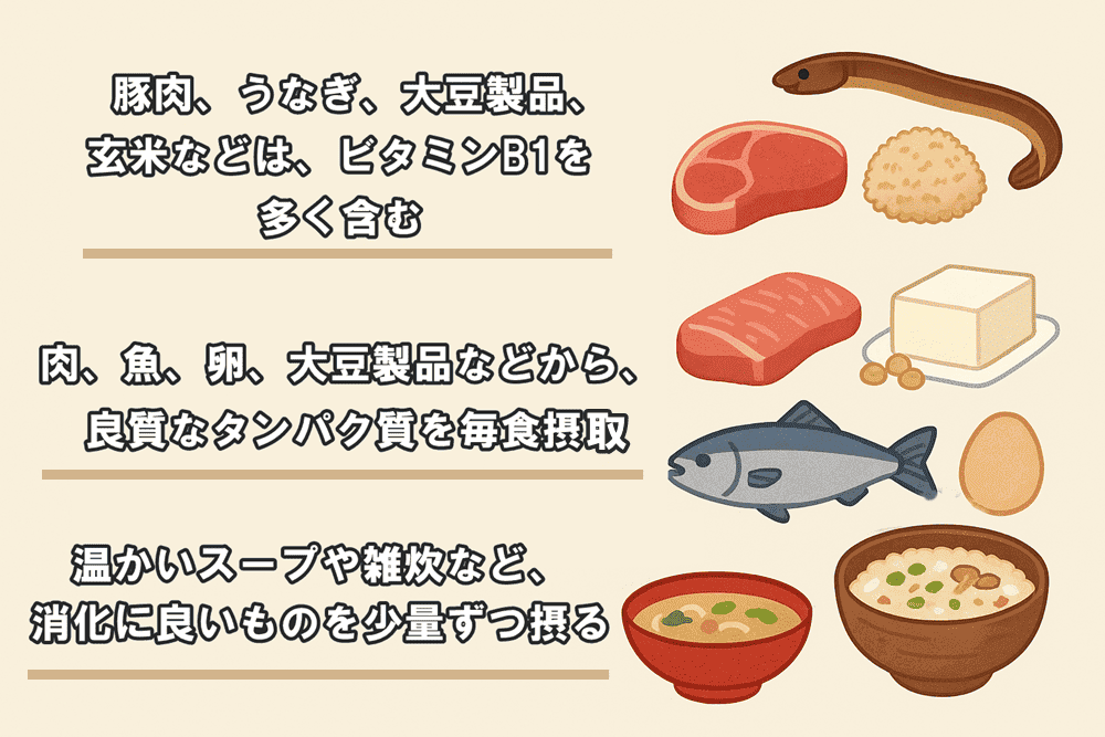 これらを積極的に取り入れることで、疲労回復を促進します。