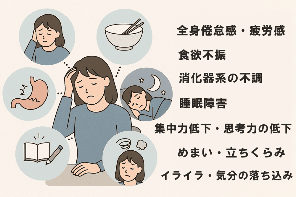 また、消化器系の働きも低下し、食欲不振や胃腸の不調を引き起こします。