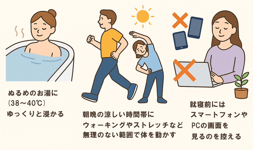 暑いからといってシャワーだけで済ませず、ぬるめのお湯(38~40℃)にゆっくりと浸かることで、副交感神経が優位になり、心身ともにリラックスできます。