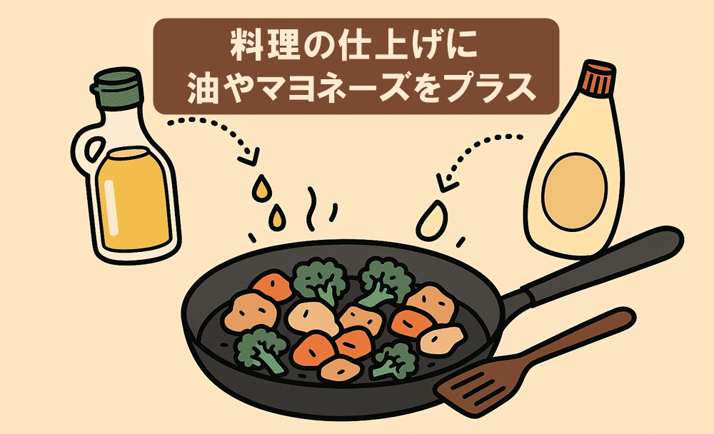 揚げ物や脂身の多い肉は重たく感じるという方は、料理の仕上げに油やマヨネーズをプラスする方法をお試しください。
