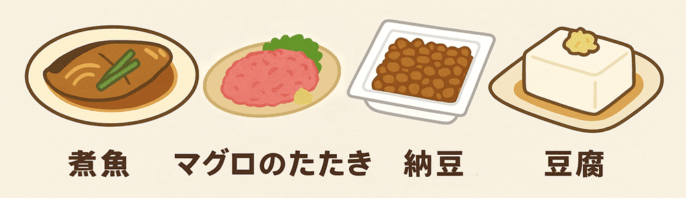 煮魚、マグロのたたき、納豆、豆腐などのやわらかい魚料理や大豆製品も併せて取り入れましょう。