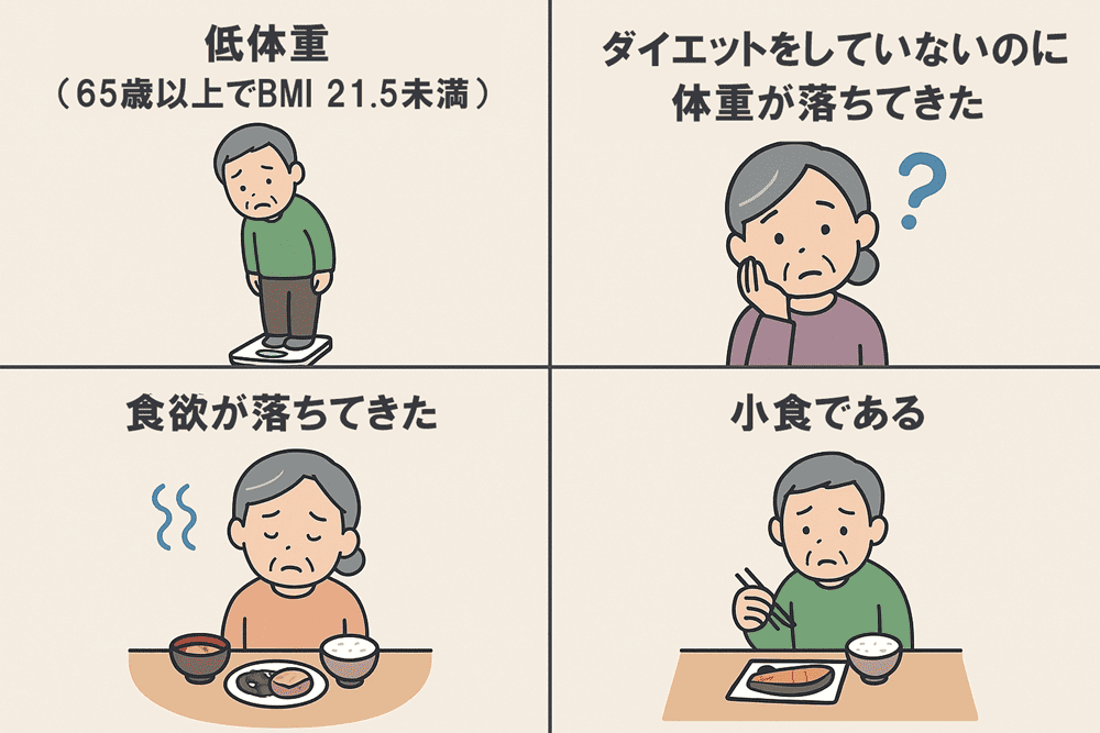 注意したいポイントは「痩せ」「意図しない体重減少」です。