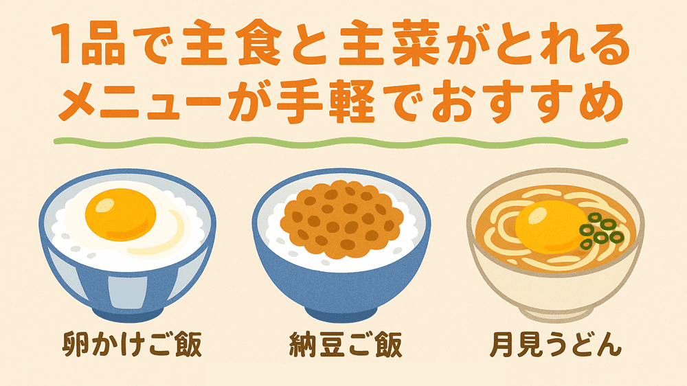卵かけご飯や納豆ご飯、月見うどんなどの1品で主食と主菜がとれるメニューが手軽でおすすめです。