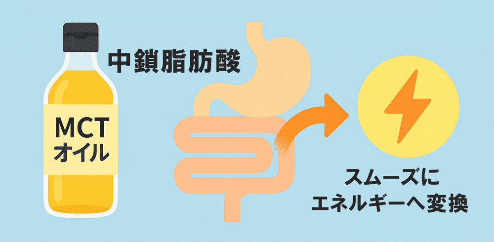 MCTオイルに含まれる「中鎖脂肪酸」は、他の油よりも消化吸収が速く、スムーズにエネルギーへ変換されます。