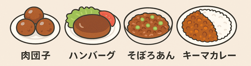 食べやすい肉料理は、肉団子、ハンバーグ、そぼろあん、キーマカレーなどのひき肉を使ったものです。