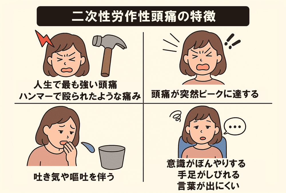 しかし、症状が急激で強烈な場合や、神経症状を伴う場合には「二次性労作性頭痛」を疑い、早急な受診が必要です。