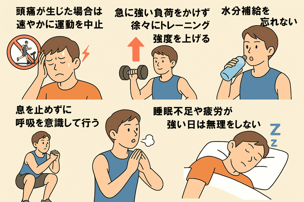 - 頭痛が生じた場合は、速やかに運動を中止する。
