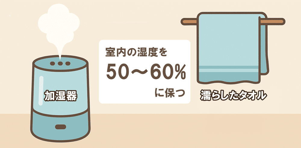 加湿器を使ったり、濡らしたタオルを部屋に干したりして、室内の湿度を50~60%に保つように心がけましょう。