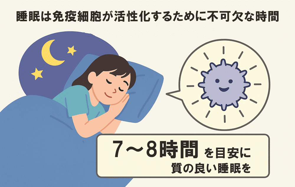 睡眠は、免疫細胞が活性化するために不可欠な時間です。7~8時間を目安に、質の良い睡眠をとりましょう。