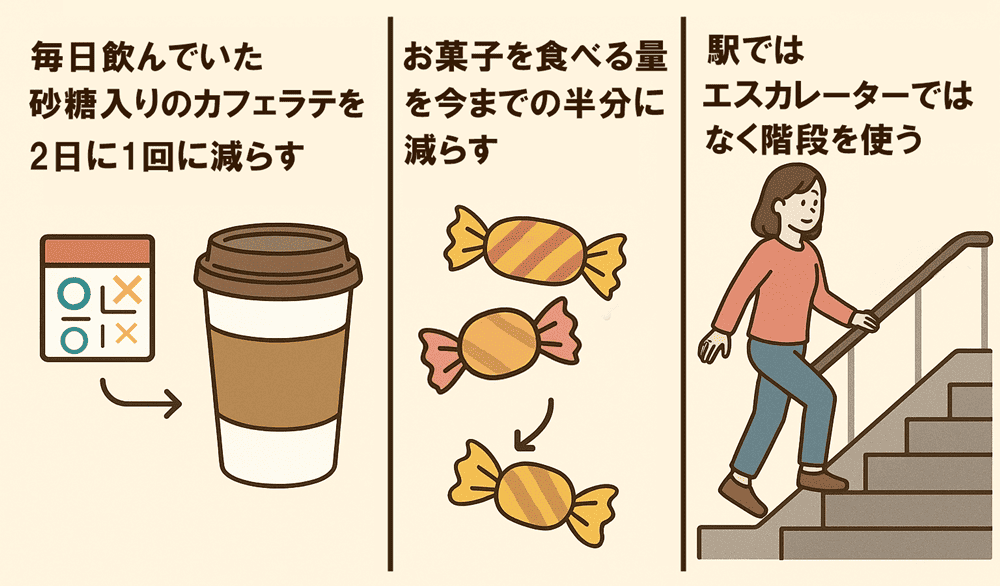また、ダイエットのための食事調整や運動は、以下のような簡単なことでも良いので、続けられる目標にすることが大切です。