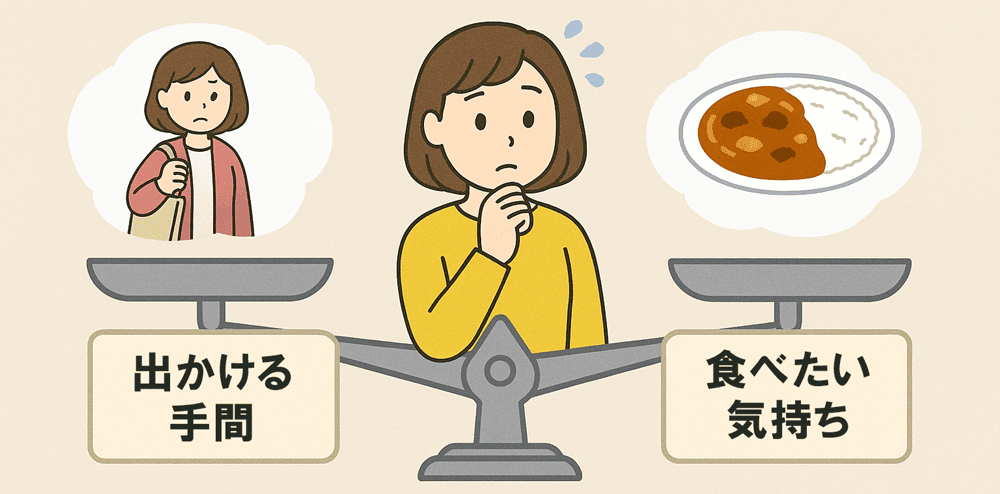 出かける手間と食べたい気持ちを冷静に比較することで、欲求が収まることもあります。