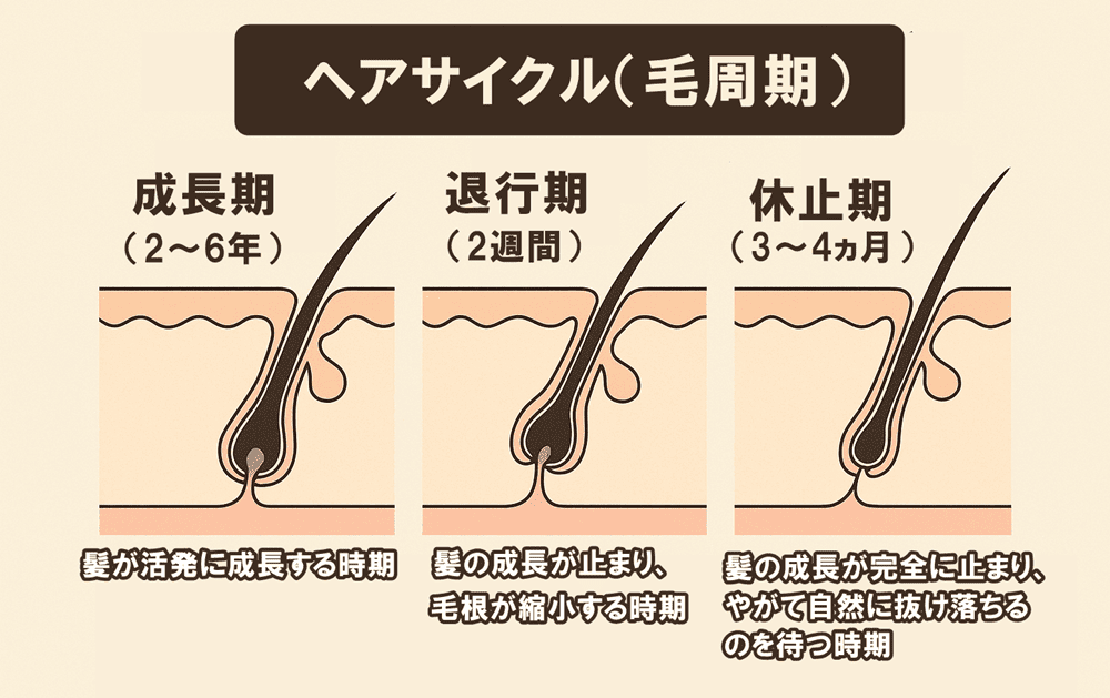 髪の毛には「ヘアサイクル(毛周期)」と呼ばれる成長サイクルがあり、以下の3つの段階から成り立っています。