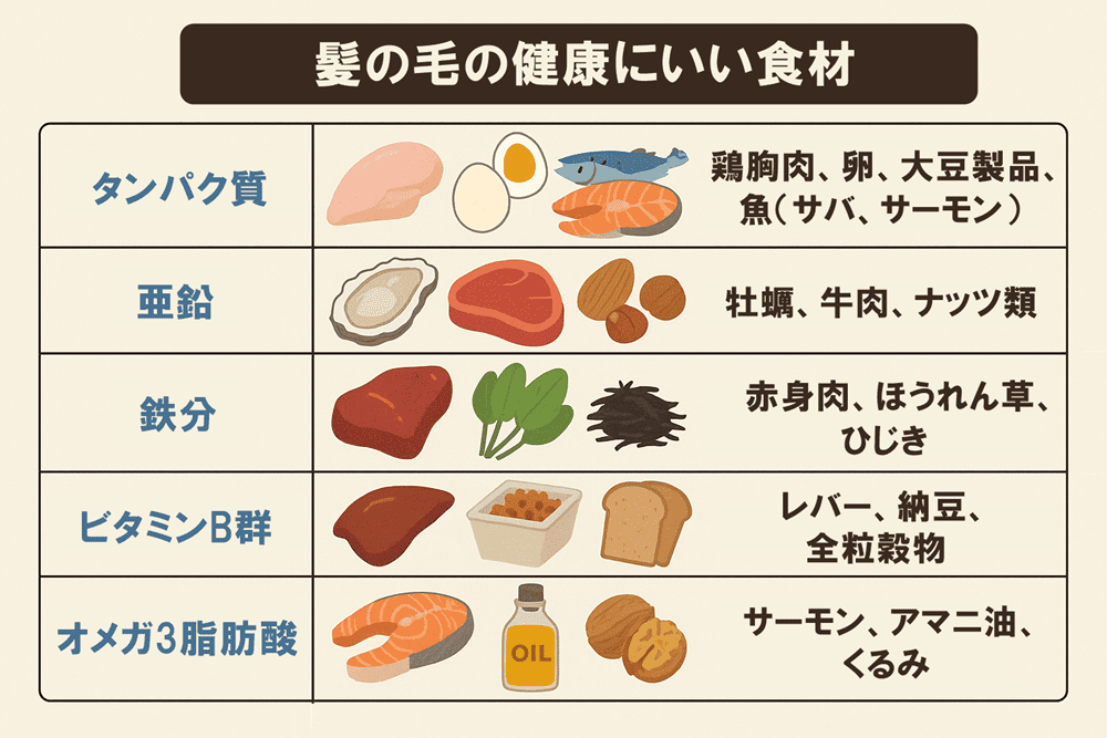 髪の成長に必要な栄養素としては、タンパク質のほかに、亜鉛、鉄、ビタミンA・C・E、ビタミンB群(特にビオチンやB12)、オメガ3脂肪酸などが挙げられます。