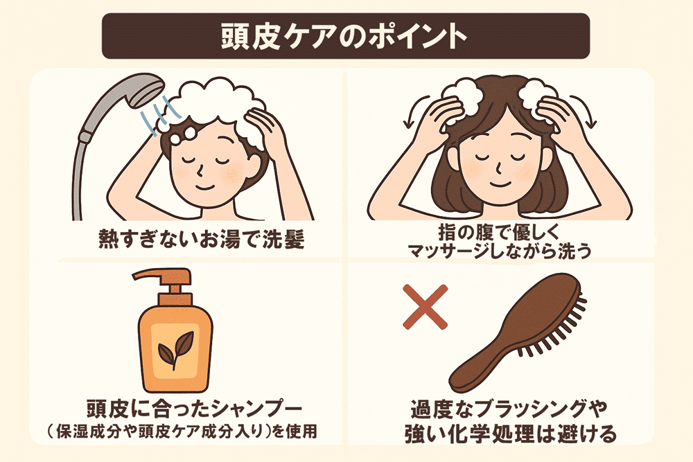 - 頭皮に合ったシャンプー(保湿成分や頭皮ケア成分入り)を使用