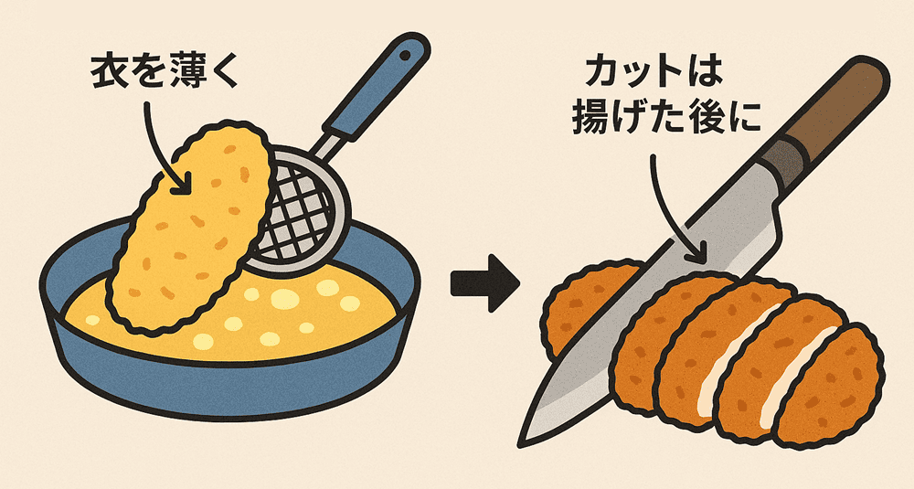 - 揚げ物は衣を薄く、カットは揚げた後に
