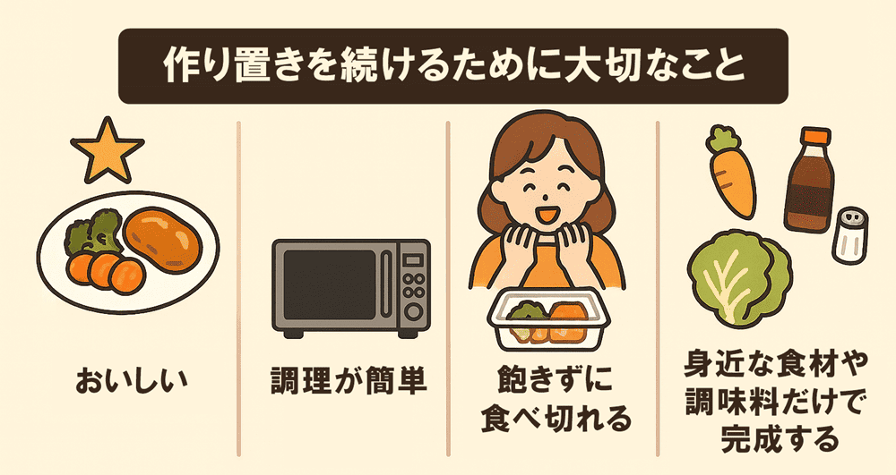 作り置きを続けるために大切なことは、以下の4つです。