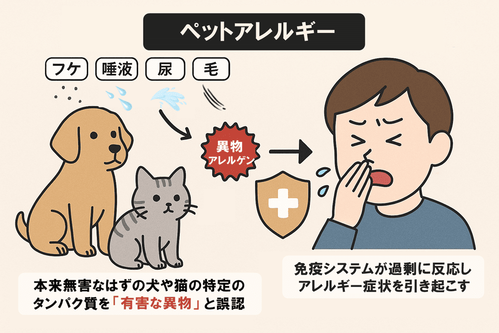 アレルギー体質の人では、本来無害なはずの犬や猫のフケ、唾液、尿、毛などに含まれる特定のタンパク質を「有害な異物」と誤認してしまいます。