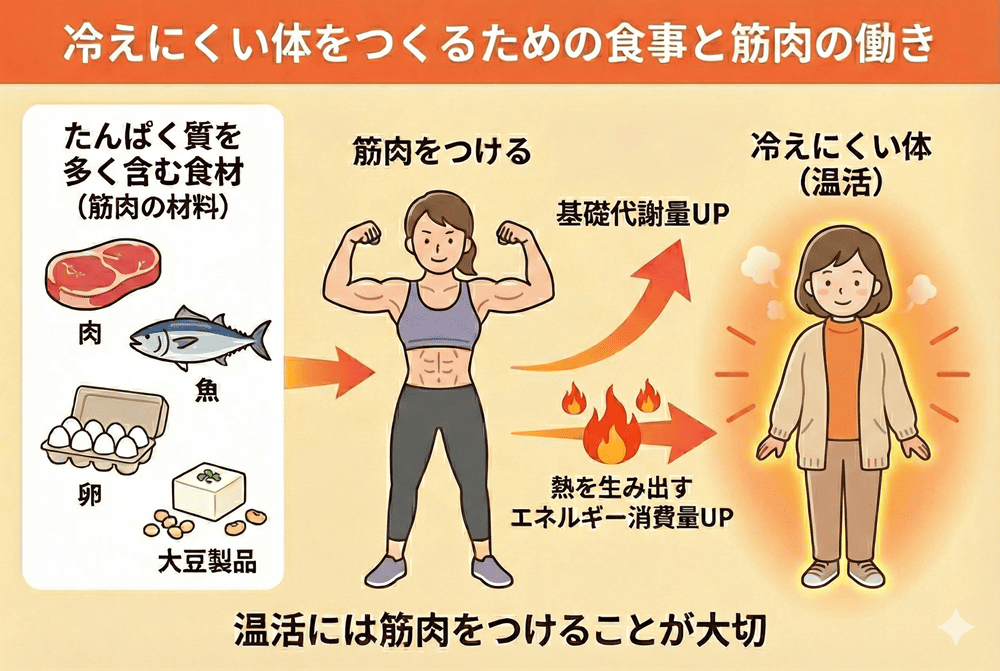 冷えにくい体をつくるためには、たんぱく質を十分摂り、筋肉をつけることが大切です。