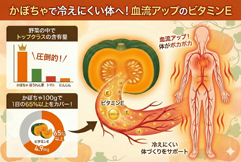 かぼちゃは、血流アップのサポートをするビタミンEを豊富に含んでおり、冷えにくい体づくりをサポートしてくれます。