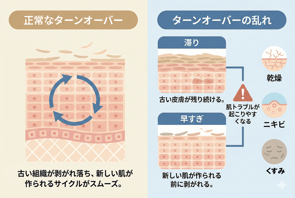 ターンオーバーが滞ると、古い皮膚が残り続ける場合や、新しい肌が作られる前に古い皮膚が剥がれてしまう場合があり、肌トラブルが起こりやすくなるのです。