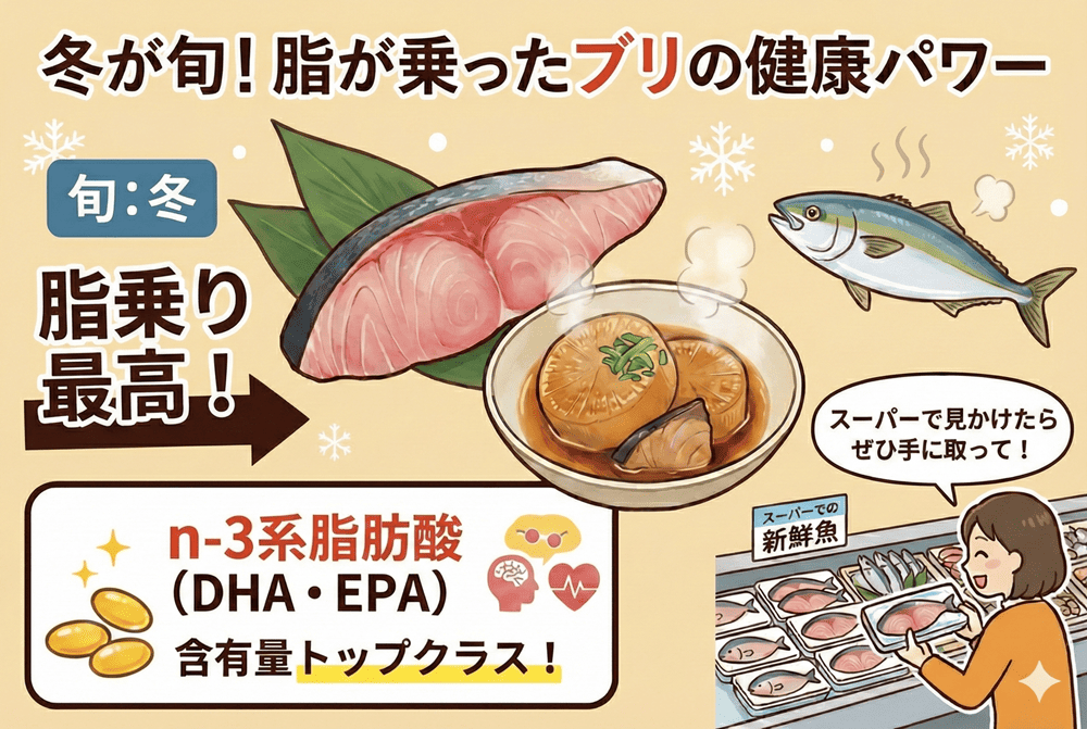 冬に旬を迎えるブリはn-3系脂肪酸の含有量が特に多く、脂が乗っておいしくなっているため、スーパーで見かけたら手に取ってみてくださいね。