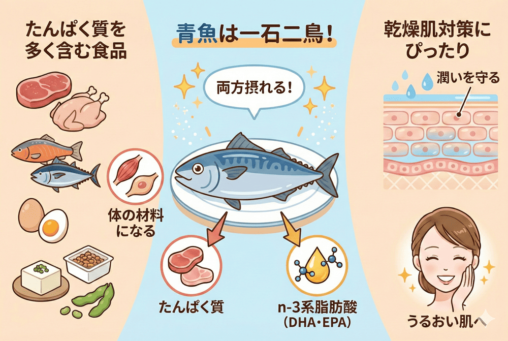 たんぱく質は肉、魚、卵、大豆製品に多く含まれており、その中でも青魚はn-3系脂肪酸も摂れる一石二鳥の食品で、乾燥肌対策にぴったりです。