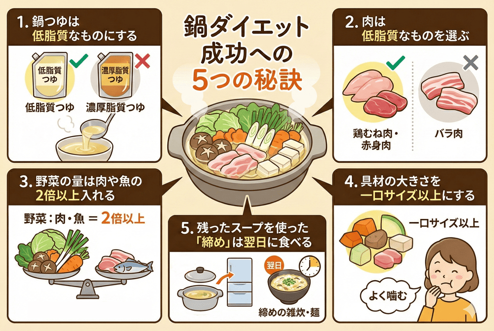 鍋料理でダイエットを成功に導くためには、5つの秘訣があります。